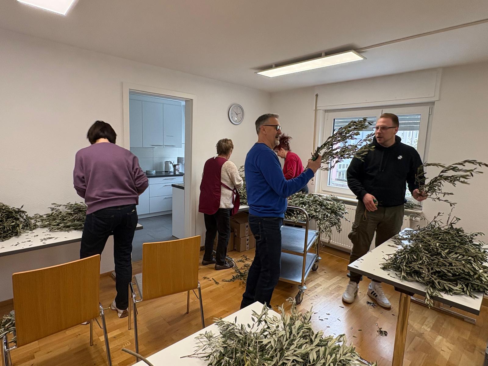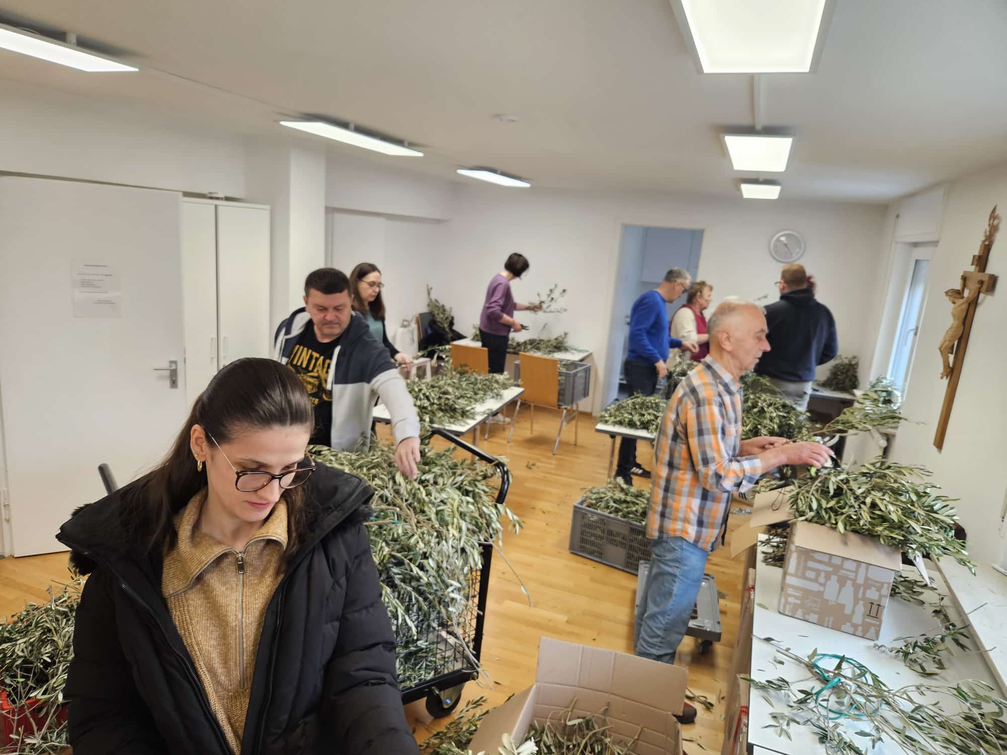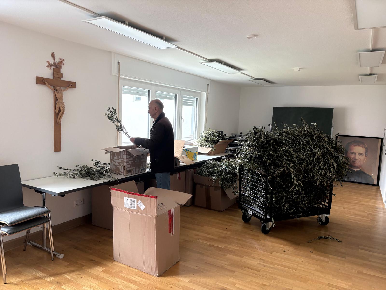 U 10 sati organizirana je akcija rezanja maslinovih grančica, u kojoj su sudjelovali volonteri i članovi misijskih vijeća iz različitih zajednica. Nakon pripreme, grančice i svijeće prevezene su u sve zajednice, gdje će sutra, na Cvjetnicu, biti podijeljene vjernicima.