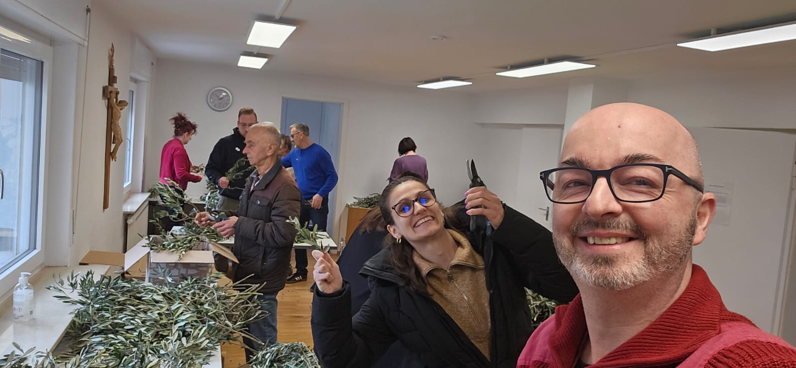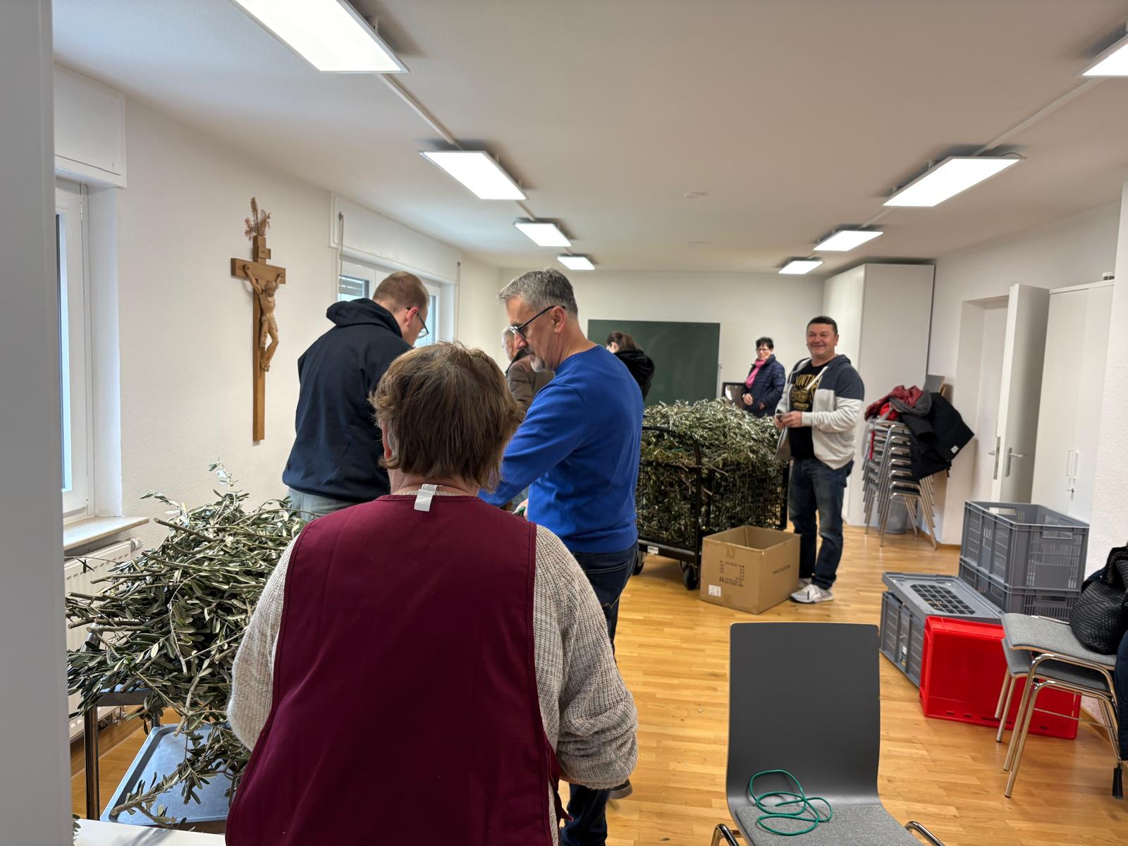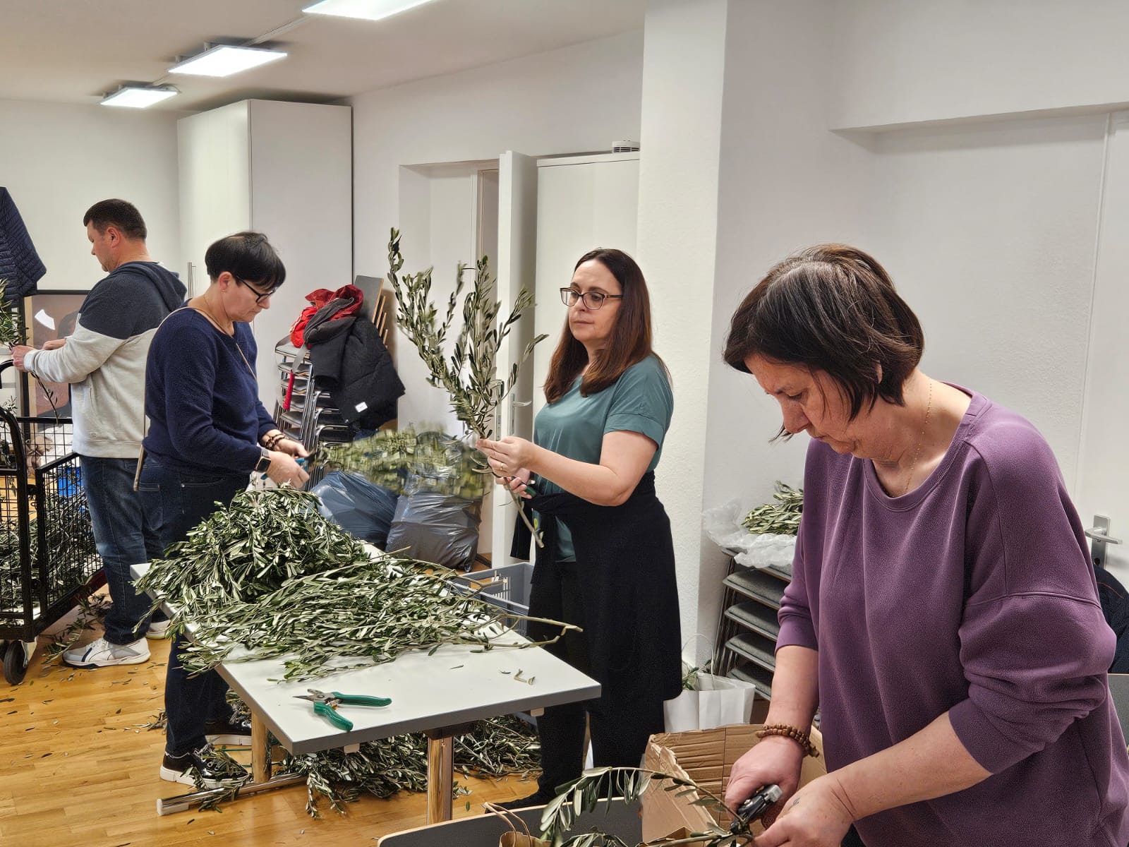 U 10 sati organizirana je akcija rezanja maslinovih grančica, u kojoj su sudjelovali volonteri i članovi misijskih vijeća iz različitih zajednica. Nakon pripreme, grančice i svijeće prevezene su u sve zajednice, gdje će sutra, na Cvjetnicu, biti podijeljene vjernicima.