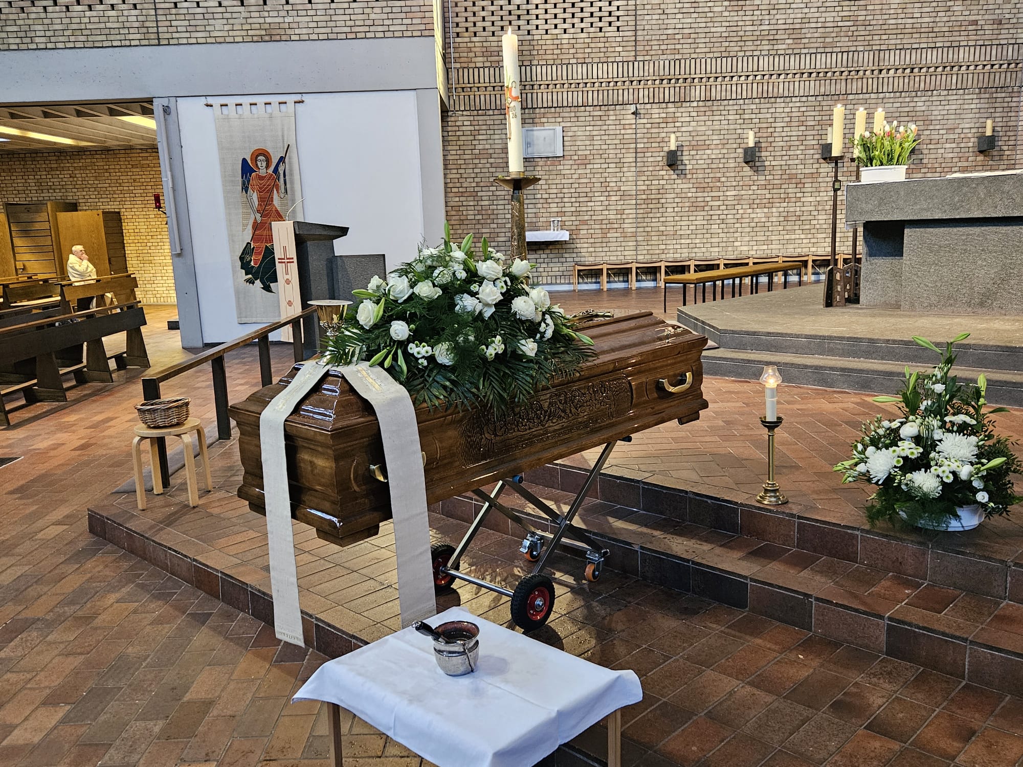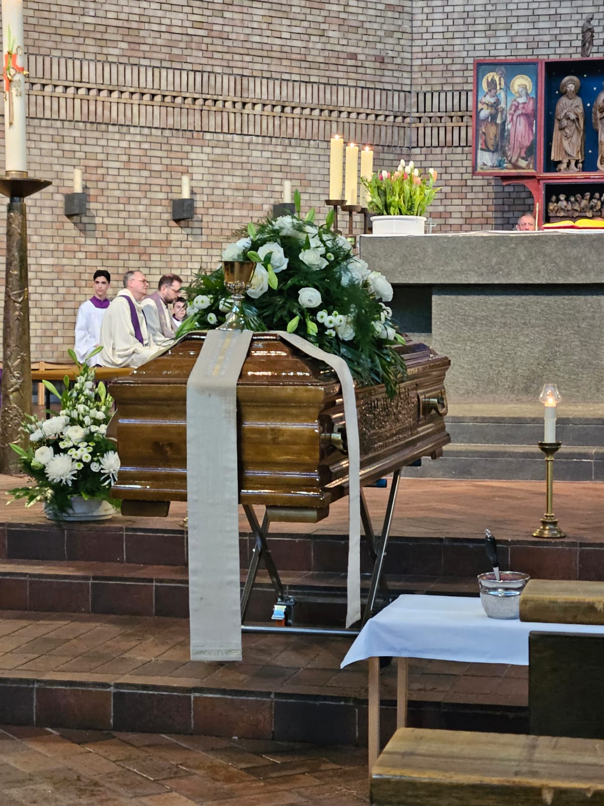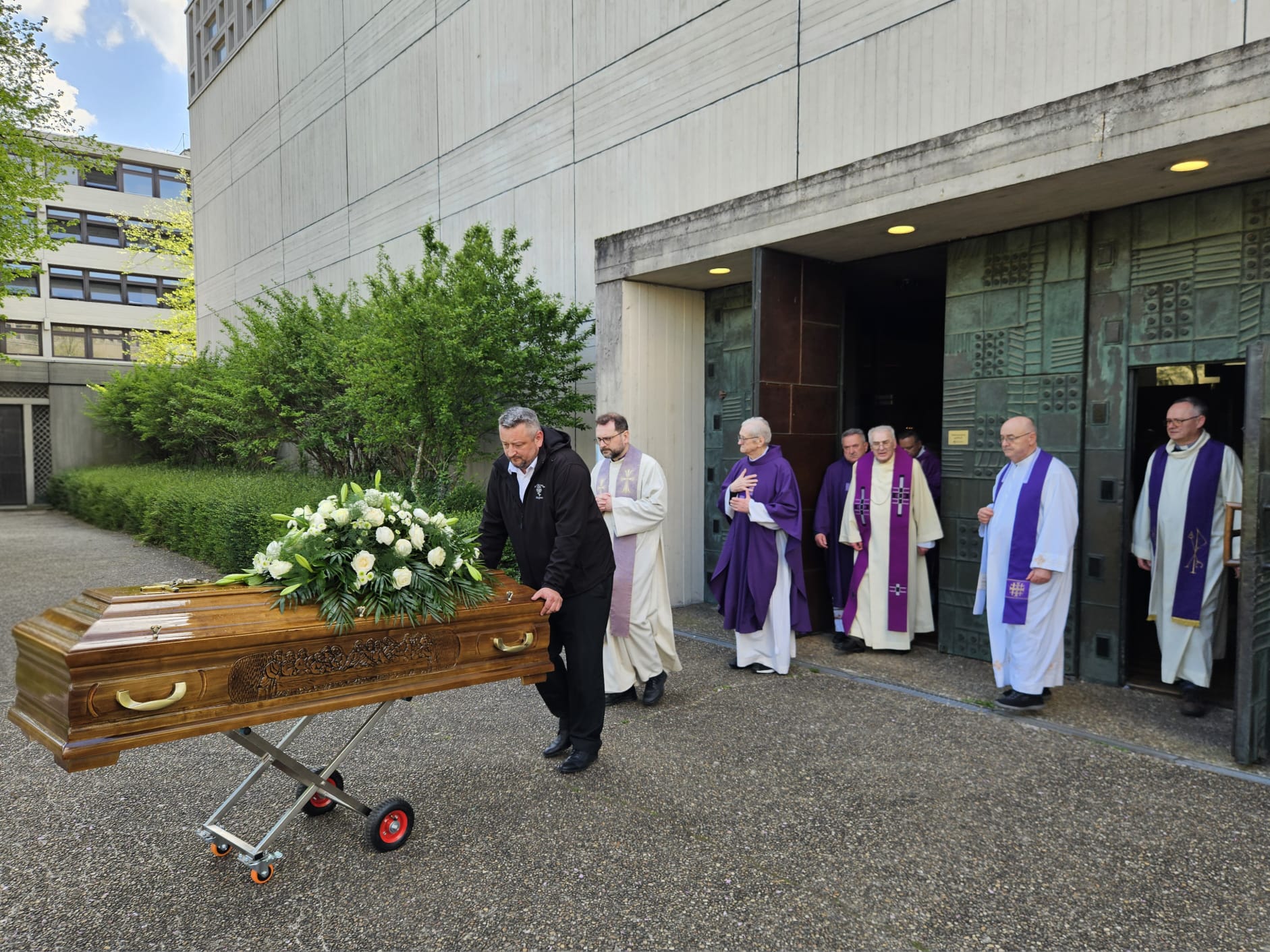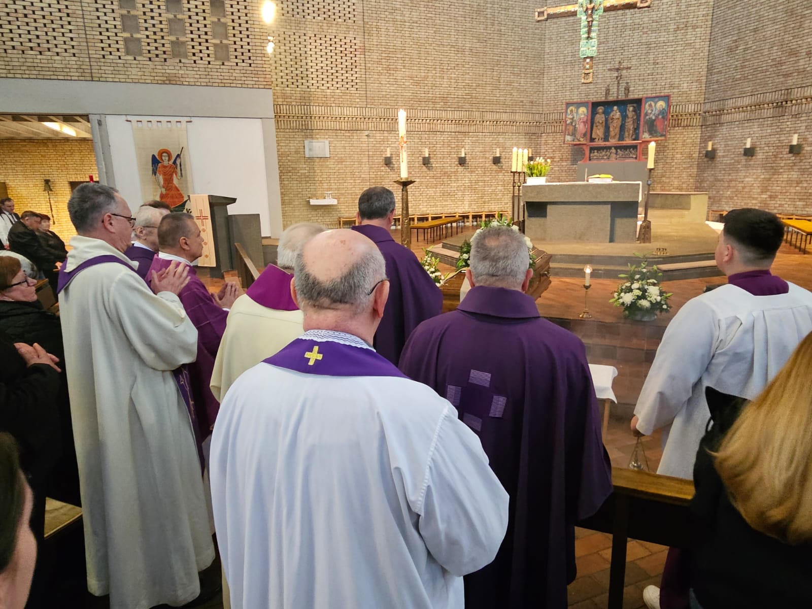 Po završetku euharistijskog slavlja, voditelj HKM Mittelbaden, don Tihomir Šutalo je izmolio molitvu odrješenja nakon čega su se svećenici i vjernici uputili k izlazu crkve kako bi se uz taktove uskrsne pjesme „Kraljice neba“ predvođene misijskim zborom, puni emocija, oprostili od svog voljenog i dragog „popa Ive“, kako su ga često nazivali, a i on sam se tako znao predstavljati, otkrivajući svoje otočko podrijetlo i ne zaboravljajući svoga rodnog kraja, otoka Raba, gdje je i ispraćen iz Karlsruhea nakon punih 55 godina pastoralnog djelovanja kako bi bio pokopan na svojoj rodnoj grudi, na rapskom groblju 20. travnja 2026.