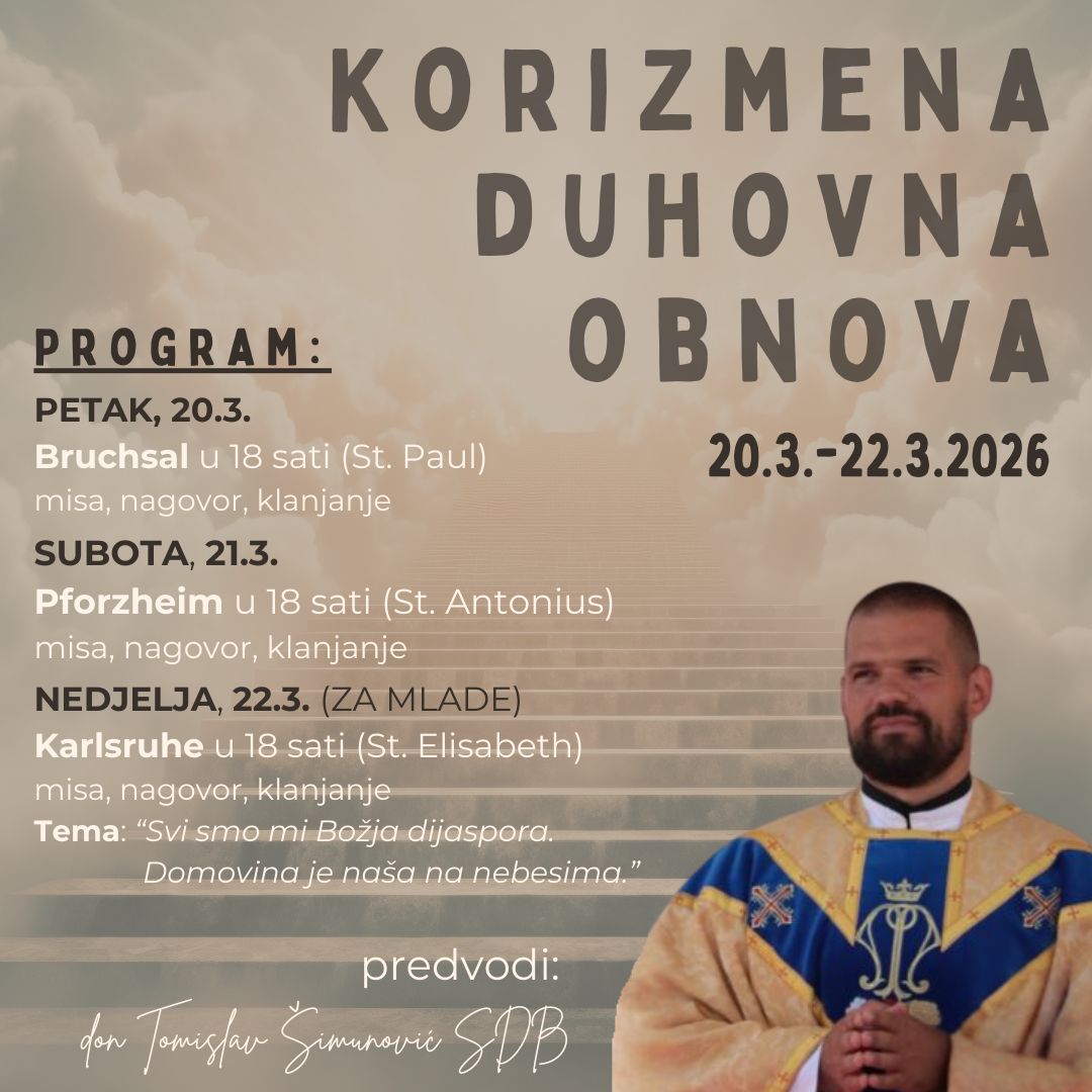 U našoj Hrvatskoj katoličkoj misiji Mittelbaden održat će se korizmena duhovna obnova od 20. do 22. ožujka 2026. godine: