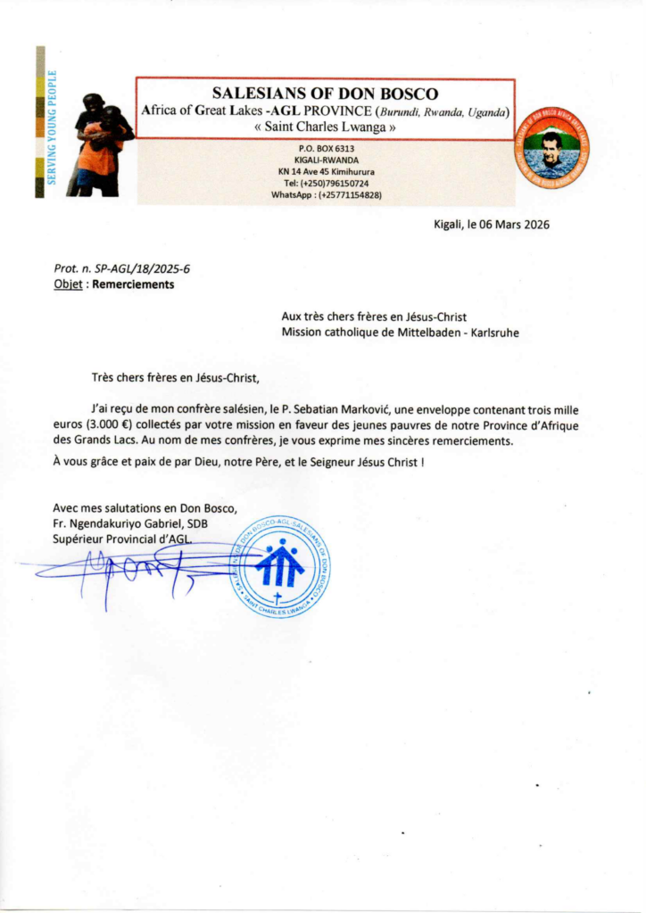 primio sam od svoga subrata salezijanca, don Sebastijana Markovića, omotnicu koja sadrži tri tisuće eura (3.000 €) prikupljenih u vašoj misiji za pomoć siromašnoj mladeži naše Provincije Afrike Velikih jezera. U ime svoje subraće izražavam vam iskrenu zahvalnost.